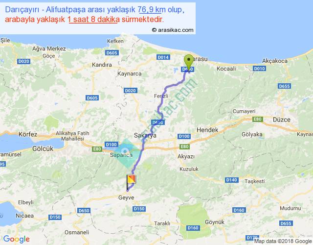 Darıçayırı - Alifuatpaşa arası yaklaşık olarak 90 km/h ile yukarıda belirtilen sürede olup, iki yerin kuş uçuşu uzaklığı (mesafesi) 62'dir. Yolculuk otobüsle 1 saat 28 dakika sürmektedir.