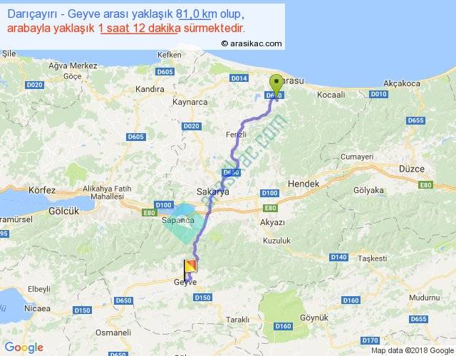 Darıçayırı - Geyve arası yaklaşık olarak 90 km/h ile yukarıda belirtilen sürede olup, iki yerin kuş uçuşu uzaklığı (mesafesi) 66'dir. Yolculuk otobüsle 1 saat 33 dakika sürmektedir.
