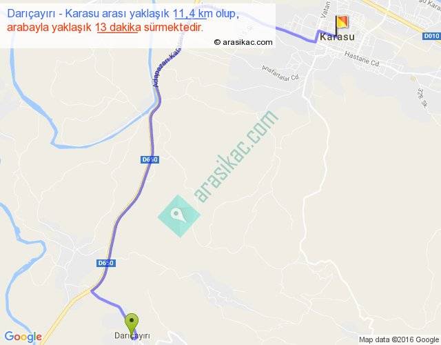 Darıçayırı - Karasu arası yaklaşık olarak 90 km/h ile yukarıda belirtilen sürede olup, iki yerin kuş uçuşu uzaklığı (mesafesi) 8'dir. Yolculuk otobüsle 16 dakika sürmektedir.