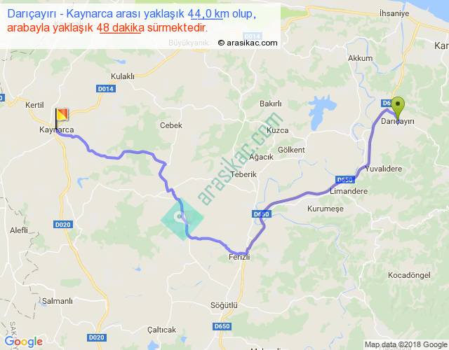 Darıçayırı - Kaynarca arası yaklaşık olarak 90 km/h ile yukarıda belirtilen sürede olup, iki yerin kuş uçuşu uzaklığı (mesafesi) 28'dir. Yolculuk otobüsle 1 saat 2 dakika sürmektedir.