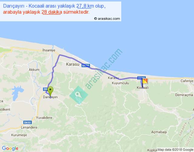 Darıçayırı - Kocaali arası yaklaşık olarak 90 km/h ile yukarıda belirtilen sürede olup, iki yerin kuş uçuşu uzaklığı (mesafesi) 18'dir. Yolculuk otobüsle 36 dakika sürmektedir.