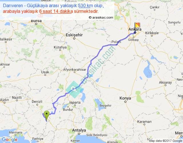 Darıveren - Güçlükaya arası yaklaşık olarak 90 km/h ile yukarıda belirtilen sürede olup, iki yerin kuş uçuşu uzaklığı (mesafesi) 419'dir. Eğer belirtilen yerler arasında uçak seferi var ise bu süre uçakla 38 dakika'ya kadar düşebilir. Yolculuk otobüsle 8 saat 6 dakika sürmektedir.
