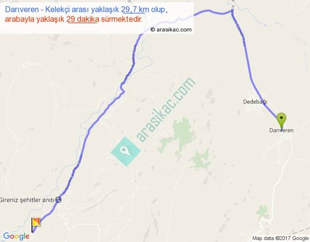 Darıveren - Kelekçi arası yaklaşık olarak 90 km/h ile yukarıda belirtilen sürede olup, iki yerin kuş uçuşu uzaklığı (mesafesi) 17'dir. Yolculuk otobüsle 37 dakika sürmektedir.