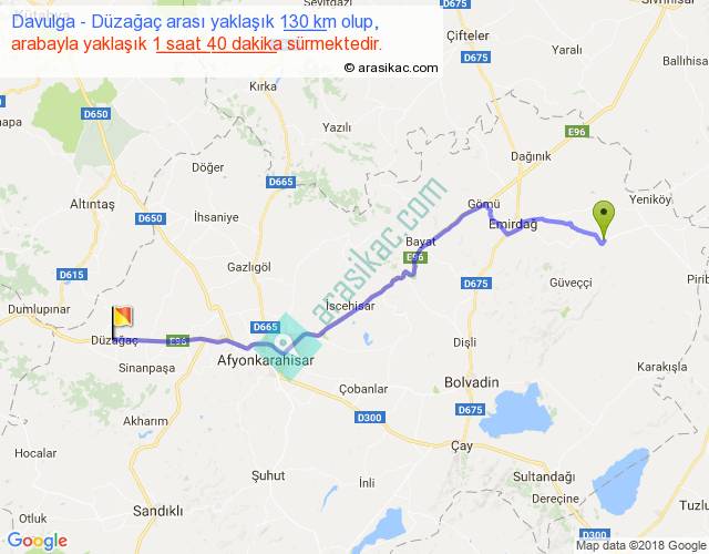 Davulga - Düzağaç arası yaklaşık olarak 90 km/h ile yukarıda belirtilen sürede olup, iki yerin kuş uçuşu uzaklığı (mesafesi) 107'dir. Yolculuk otobüsle 2 saat 10 dakika sürmektedir.