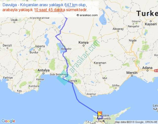 Davulga - Kılıçarslan arası yaklaşık olarak 90 km/h ile yukarıda belirtilen sürede olup, iki yerin kuş uçuşu uzaklığı (mesafesi) 440'dir. Eğer belirtilen yerler arasında uçak seferi var ise bu süre uçakla 40 dakika'ya kadar düşebilir. Yolculuk otobüsle 13 saat 58 dakika sürmektedir.