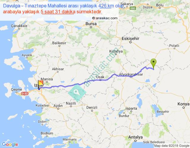 Davulga - Tınaztepe Mahallesi arası yaklaşık olarak 90 km/h ile yukarıda belirtilen sürede olup, iki yerin kuş uçuşu uzaklığı (mesafesi) 372'dir. Eğer belirtilen yerler arasında uçak seferi var ise bu süre uçakla 34 dakika'ya kadar düşebilir. Yolculuk otobüsle 7 saat 10 dakika sürmektedir.