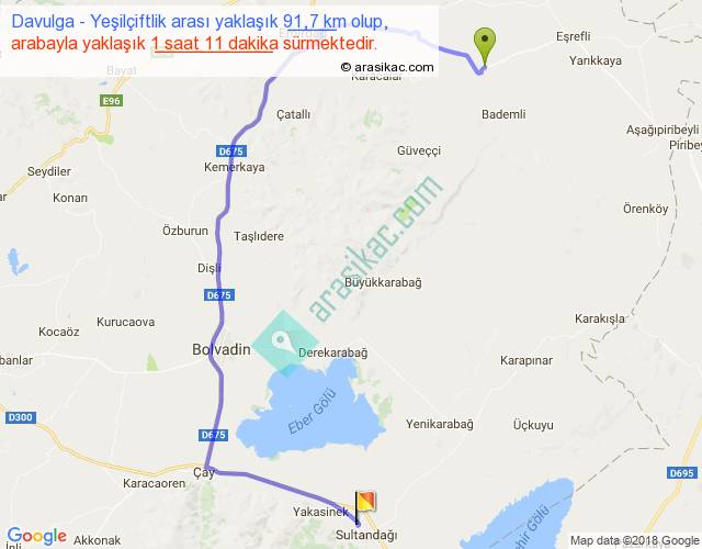 Davulga - Yeşilçiftlik arası yaklaşık olarak 90 km/h ile yukarıda belirtilen sürede olup, iki yerin kuş uçuşu uzaklığı (mesafesi) 51'dir. Yolculuk otobüsle 1 saat 32 dakika sürmektedir.