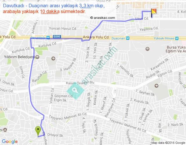 Davutkadı - Duaçınarı arası yaklaşık olarak 90 km/h ile yukarıda belirtilen sürede olup, iki yerin kuş uçuşu uzaklığı (mesafesi) 2'dir. Yolculuk otobüsle 13 dakika sürmektedir.