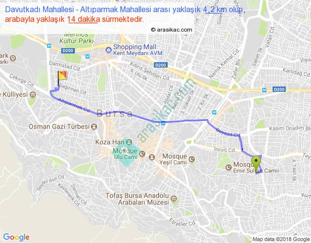Davutkadı Mahallesi - Altıparmak Mahallesi arası yaklaşık olarak 90 km/h ile yukarıda belirtilen sürede olup, iki yerin kuş uçuşu uzaklığı (mesafesi) 3'dir. Yolculuk otobüsle 18 dakika sürmektedir.
