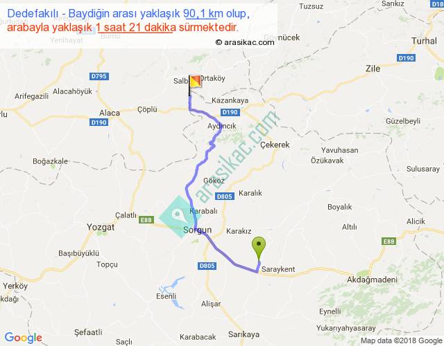 Dedefakılı - Baydiğin arası yaklaşık olarak 90 km/h ile yukarıda belirtilen sürede olup, iki yerin kuş uçuşu uzaklığı (mesafesi) 60'dir. Yolculuk otobüsle 1 saat 45 dakika sürmektedir.