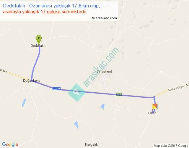 Dedefakılı - Ozan arası yaklaşık olarak 90 km/h ile yukarıda belirtilen sürede olup, iki yerin kuş uçuşu uzaklığı (mesafesi) 13'dir. Yolculuk otobüsle 22 dakika sürmektedir.