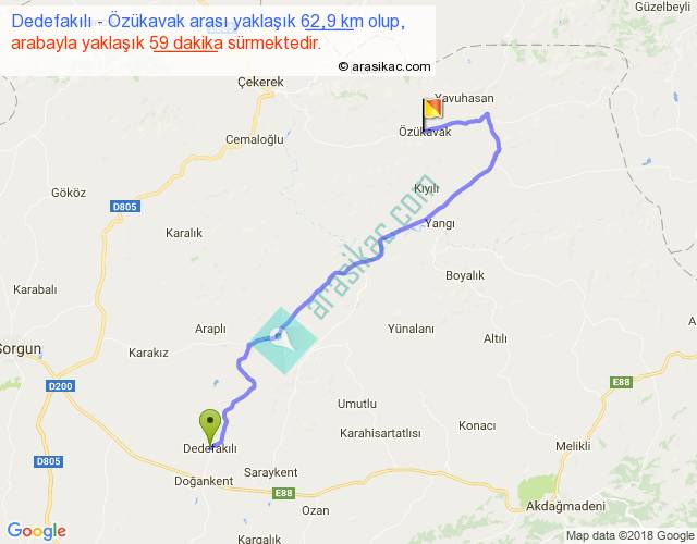 Dedefakılı - Özükavak arası yaklaşık olarak 90 km/h ile yukarıda belirtilen sürede olup, iki yerin kuş uçuşu uzaklığı (mesafesi) 41'dir. Yolculuk otobüsle 1 saat 16 dakika sürmektedir.