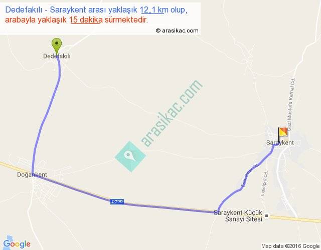 Dedefakılı - Saraykent arası yaklaşık olarak 90 km/h ile yukarıda belirtilen sürede olup, iki yerin kuş uçuşu uzaklığı (mesafesi) 7'dir. Yolculuk otobüsle 19 dakika sürmektedir.