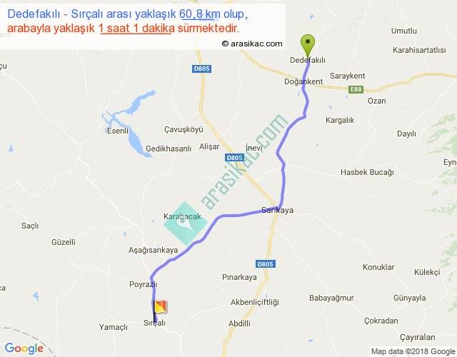 Dedefakılı - Sırçalı arası yaklaşık olarak 90 km/h ile yukarıda belirtilen sürede olup, iki yerin kuş uçuşu uzaklığı (mesafesi) 50'dir. Yolculuk otobüsle 1 saat 19 dakika sürmektedir.