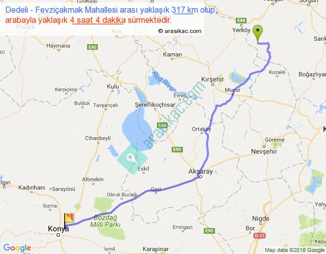 Dedeli - Fevziçakmak Mahallesi arası yaklaşık olarak 90 km/h ile yukarıda belirtilen sürede olup, iki yerin kuş uçuşu uzaklığı (mesafesi) 249'dir. Yolculuk otobüsle 5 saat 17 dakika sürmektedir.