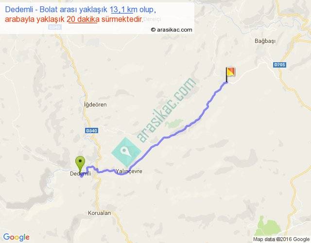 Dedemli - Bolat arası yaklaşık olarak 90 km/h ile yukarıda belirtilen sürede olup, iki yerin kuş uçuşu uzaklığı (mesafesi) 11'dir. Yolculuk otobüsle 26 dakika sürmektedir.