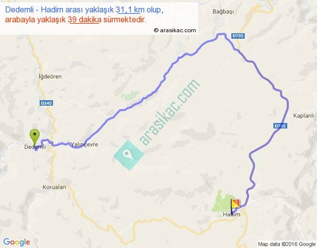 Dedemli - Hadim arası yaklaşık olarak 90 km/h ile yukarıda belirtilen sürede olup, iki yerin kuş uçuşu uzaklığı (mesafesi) 13'dir. Yolculuk otobüsle 50 dakika sürmektedir.