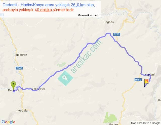 Dedemli - Hadim Konya arası yaklaşık olarak 90 km/h ile yukarıda belirtilen sürede olup, iki yerin kuş uçuşu uzaklığı (mesafesi) 16'dir. Yolculuk otobüsle 52 dakika sürmektedir.