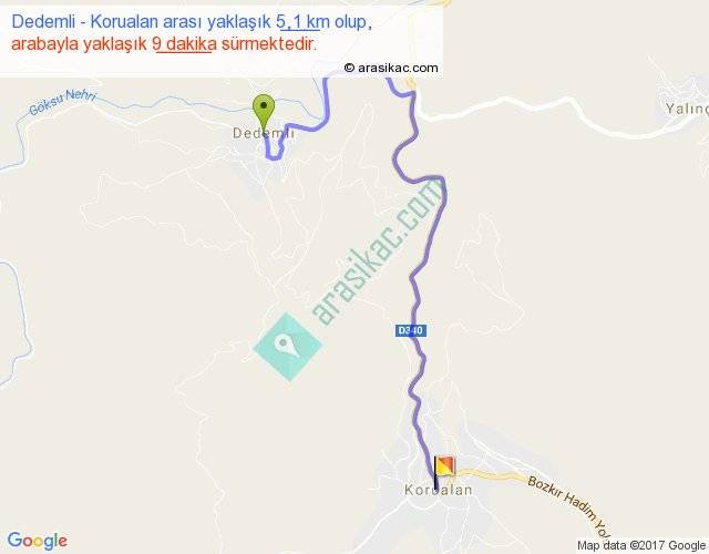 Dedemli - Korualan arası yaklaşık olarak 90 km/h ile yukarıda belirtilen sürede olup, iki yerin kuş uçuşu uzaklığı (mesafesi) 3'dir. Yolculuk otobüsle 11 dakika sürmektedir.