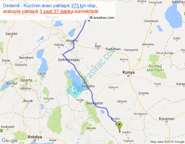 Dedemli - Kuzören arası yaklaşık olarak 90 km/h ile yukarıda belirtilen sürede olup, iki yerin kuş uçuşu uzaklığı (mesafesi) 191'dir. Yolculuk otobüsle 4 saat 42 dakika sürmektedir.