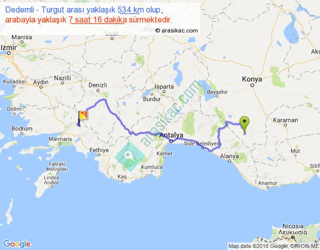 Dedemli - Turgut arası yaklaşık olarak 90 km/h ile yukarıda belirtilen sürede olup, iki yerin kuş uçuşu uzaklığı (mesafesi) 320'dir. Eğer belirtilen yerler arasında uçak seferi var ise bu süre uçakla 29 dakika'ya kadar düşebilir. Yolculuk otobüsle 9 saat 26 dakika sürmektedir.