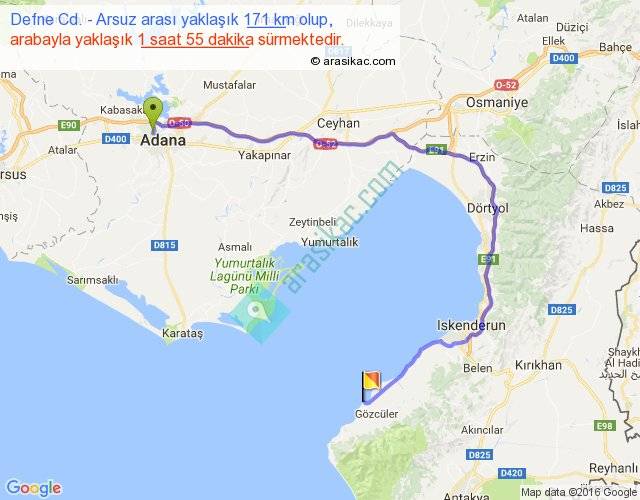 Defne Cd. - Arsuz arası yaklaşık olarak 90 km/h ile yukarıda belirtilen sürede olup, iki yerin kuş uçuşu uzaklığı (mesafesi) 83'dir. Yolculuk otobüsle 2 saat 29 dakika sürmektedir.