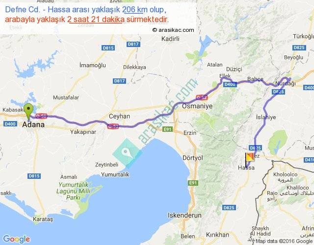 Defne Cd. - Hassa arası yaklaşık olarak 90 km/h ile yukarıda belirtilen sürede olup, iki yerin kuş uçuşu uzaklığı (mesafesi) 110'dir. Yolculuk otobüsle 3 saat 3 dakika sürmektedir.
