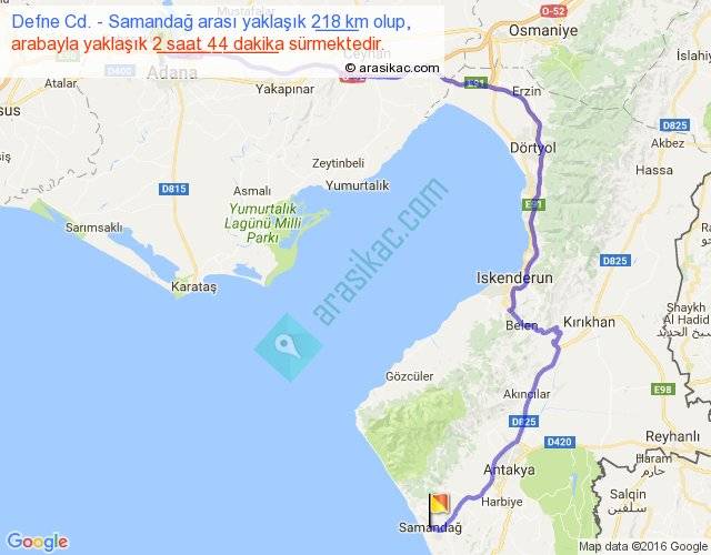Defne Cd. - Samandağ arası yaklaşık olarak 90 km/h ile yukarıda belirtilen sürede olup, iki yerin kuş uçuşu uzaklığı (mesafesi) 118'dir. Yolculuk otobüsle 3 saat 33 dakika sürmektedir.