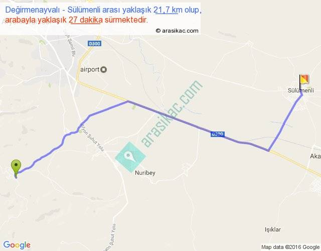 Değirmenayvalı - Sülümenli arası yaklaşık olarak 90 km/h ile yukarıda belirtilen sürede olup, iki yerin kuş uçuşu uzaklığı (mesafesi) 18'dir. Yolculuk otobüsle 35 dakika sürmektedir.