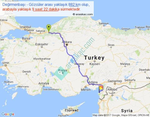 Değirmenbaşı - Gözcüler arası yaklaşık olarak 90 km/h ile yukarıda belirtilen sürede olup, iki yerin kuş uçuşu uzaklığı (mesafesi) 635'dir. Eğer belirtilen yerler arasında uçak seferi var ise bu süre uçakla 58 dakika'ya kadar düşebilir. Yolculuk otobüsle 12 saat 10 dakika sürmektedir.