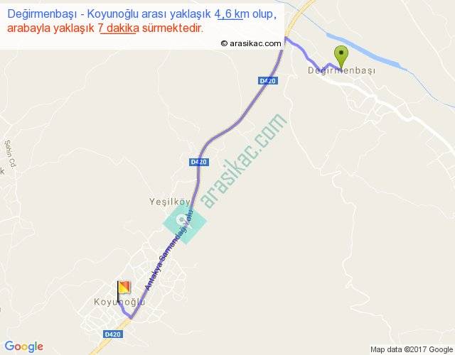 Değirmenbaşı - Koyunoğlu arası yaklaşık olarak 90 km/h ile yukarıda belirtilen sürede olup, iki yerin kuş uçuşu uzaklığı (mesafesi) 3'dir. Yolculuk otobüsle 9 dakika sürmektedir.