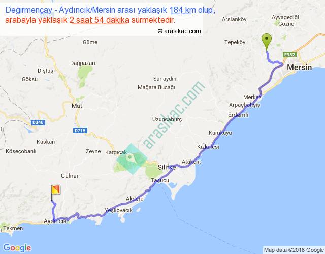 Değirmençay - Aydıncık Mersin arası yaklaşık olarak 90 km/h ile yukarıda belirtilen sürede olup, iki yerin kuş uçuşu uzaklığı (mesafesi) 126'dir. Yolculuk otobüsle 3 saat 46 dakika sürmektedir.