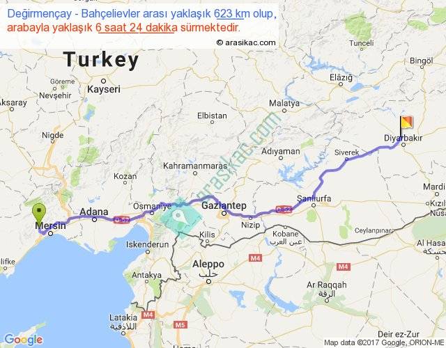 Değirmençay - Bahçelievler arası yaklaşık olarak 90 km/h ile yukarıda belirtilen sürede olup, iki yerin kuş uçuşu uzaklığı (mesafesi) 517'dir. Eğer belirtilen yerler arasında uçak seferi var ise bu süre uçakla 47 dakika'ya kadar düşebilir. Yolculuk otobüsle 8 saat 19 dakika sürmektedir.