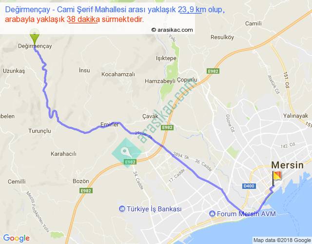 Değirmençay - Cami Şerif Mahallesi arası yaklaşık olarak 90 km/h ile yukarıda belirtilen sürede olup, iki yerin kuş uçuşu uzaklığı (mesafesi) 17'dir. Yolculuk otobüsle 49 dakika sürmektedir.