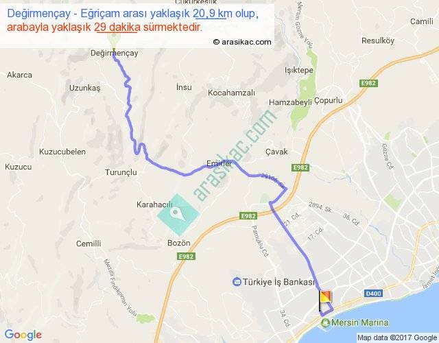 Değirmençay - Eğriçam arası yaklaşık olarak 90 km/h ile yukarıda belirtilen sürede olup, iki yerin kuş uçuşu uzaklığı (mesafesi) 15'dir. Yolculuk otobüsle 37 dakika sürmektedir.