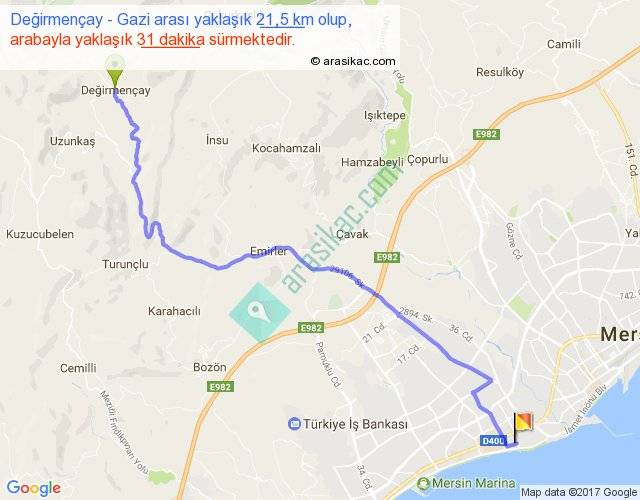 Değirmençay - Gazi arası yaklaşık olarak 90 km/h ile yukarıda belirtilen sürede olup, iki yerin kuş uçuşu uzaklığı (mesafesi) 16'dir. Yolculuk otobüsle 40 dakika sürmektedir.