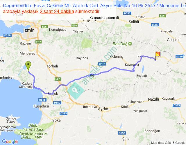 Degırmendere Fevzı Cakmak Mh. Atatürk Cad. Akyer Sok. No:16 Pk:35477 Menderes İzmir - 35890 Kiraz İzmir arası detaylı bilgi