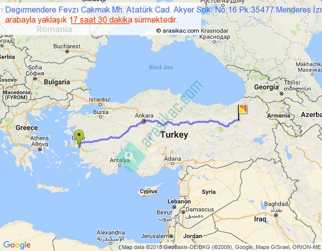 Degırmendere Fevzı Cakmak Mh. Atatürk Cad. Akyer Sok. No:16 Pk:35477 Menderes İzmir - Kahramanlar arası yaklaşık olarak 90 km/h ile yukarıda belirtilen sürede olup, iki yerin kuş uçuşu uzaklığı (mesafesi) 1216'dir. Eğer belirtilen yerler arasında uçak seferi var ise bu süre uçakla 1 saat 52 dakika'ya kadar düşebilir. Yolculuk otobüsle 22 saat 45 dakika sürmektedir.