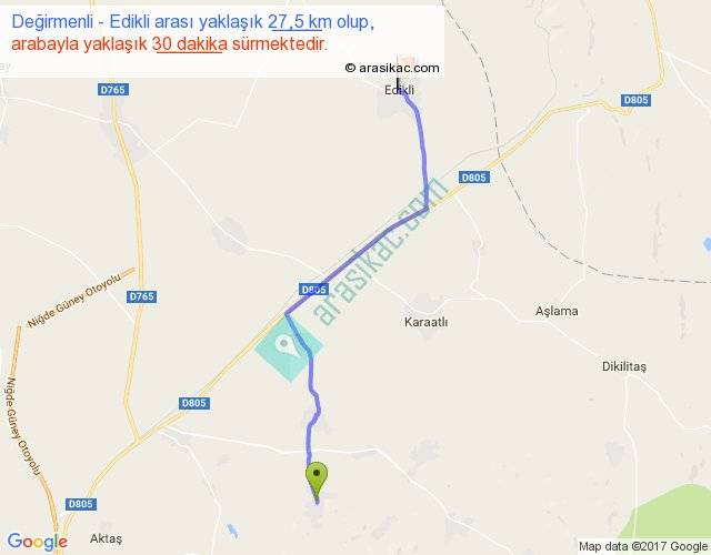 Değirmenli - Edikli arası yaklaşık olarak 90 km/h ile yukarıda belirtilen sürede olup, iki yerin kuş uçuşu uzaklığı (mesafesi) 23'dir. Yolculuk otobüsle 39 dakika sürmektedir.