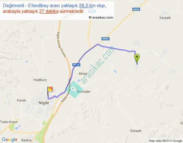Değirmenli - Efendibey arası yaklaşık olarak 90 km/h ile yukarıda belirtilen sürede olup, iki yerin kuş uçuşu uzaklığı (mesafesi) 20'dir. Yolculuk otobüsle 35 dakika sürmektedir.