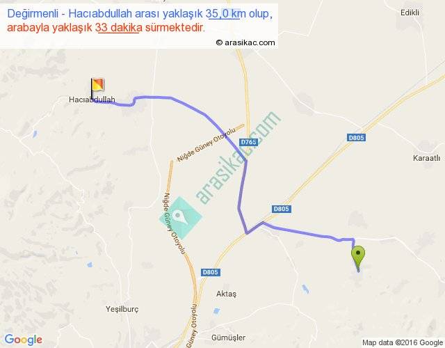 Değirmenli - Hacıabdullah arası yaklaşık olarak 90 km/h ile yukarıda belirtilen sürede olup, iki yerin kuş uçuşu uzaklığı (mesafesi) 27'dir. Yolculuk otobüsle 42 dakika sürmektedir.