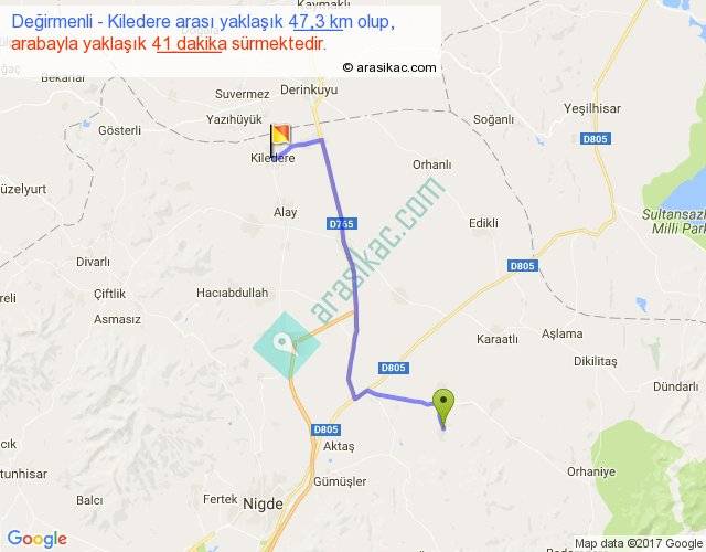 Değirmenli - Kiledere arası yaklaşık olarak 90 km/h ile yukarıda belirtilen sürede olup, iki yerin kuş uçuşu uzaklığı (mesafesi) 35'dir. Yolculuk otobüsle 53 dakika sürmektedir.