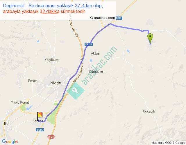 Değirmenli - Sazlıca arası yaklaşık olarak 90 km/h ile yukarıda belirtilen sürede olup, iki yerin kuş uçuşu uzaklığı (mesafesi) 28'dir. Yolculuk otobüsle 41 dakika sürmektedir.