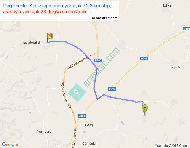 Değirmenli - Yıldıztepe arası yaklaşık olarak 90 km/h ile yukarıda belirtilen sürede olup, iki yerin kuş uçuşu uzaklığı (mesafesi) 24'dir. Yolculuk otobüsle 36 dakika sürmektedir.