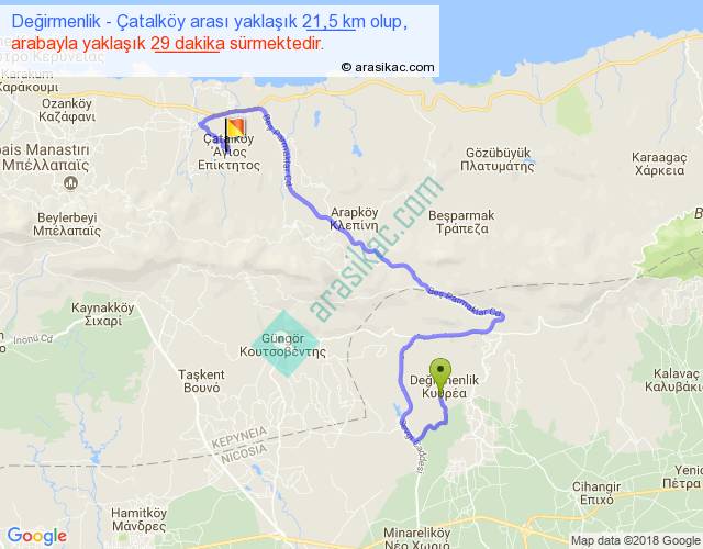 Değirmenlik - Çatalköy arası yaklaşık olarak 90 km/h ile yukarıda belirtilen sürede olup, iki yerin kuş uçuşu uzaklığı (mesafesi) 9'dir. Yolculuk otobüsle 37 dakika sürmektedir.