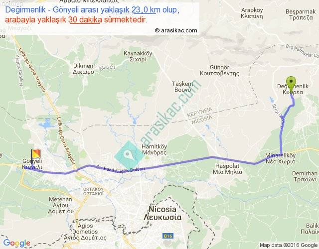 Değirmenlik - Gönyeli arası yaklaşık olarak 90 km/h ile yukarıda belirtilen sürede olup, iki yerin kuş uçuşu uzaklığı (mesafesi) 17'dir. Yolculuk otobüsle 39 dakika sürmektedir.