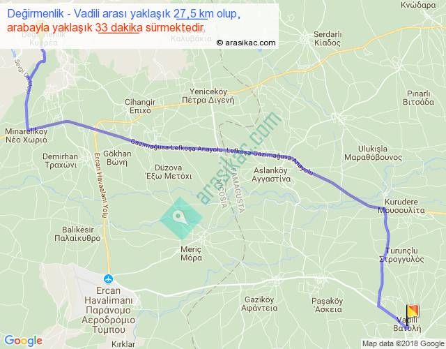 Değirmenlik - Vadili arası yaklaşık olarak 90 km/h ile yukarıda belirtilen sürede olup, iki yerin kuş uçuşu uzaklığı (mesafesi) 21'dir. Yolculuk otobüsle 42 dakika sürmektedir.