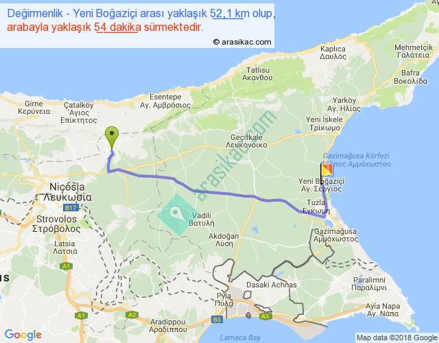 Değirmenlik - Yeni Boğaziçi arası yaklaşık olarak 90 km/h ile yukarıda belirtilen sürede olup, iki yerin kuş uçuşu uzaklığı (mesafesi) 38'dir. Yolculuk otobüsle 1 saat 10 dakika sürmektedir.