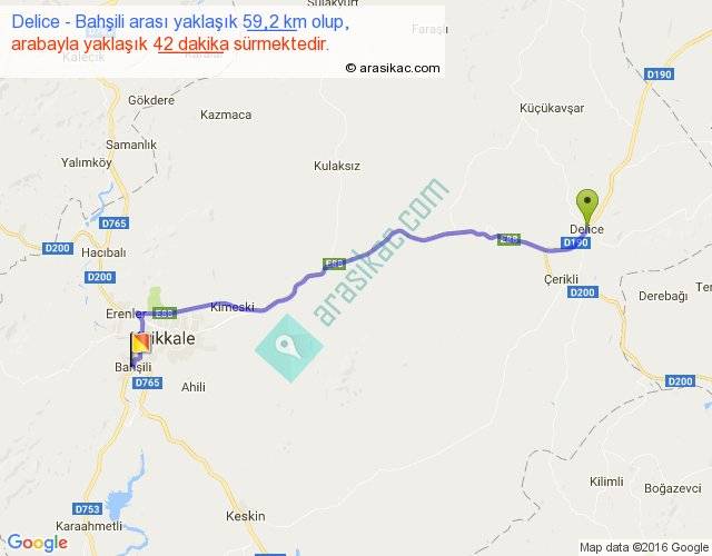 Delice - Bahşili arası yaklaşık olarak 90 km/h ile yukarıda belirtilen sürede olup, iki yerin kuş uçuşu uzaklığı (mesafesi) 50'dir. Yolculuk otobüsle 54 dakika sürmektedir.