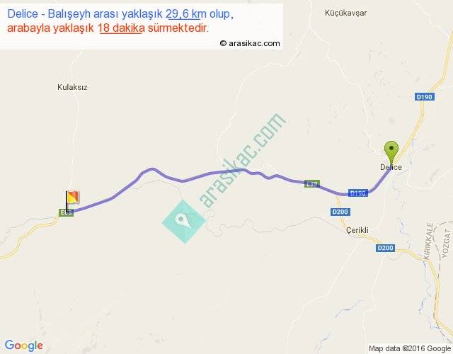 Delice - Balışeyh arası yaklaşık olarak 90 km/h ile yukarıda belirtilen sürede olup, iki yerin kuş uçuşu uzaklığı (mesafesi) 27'dir. Yolculuk otobüsle 23 dakika sürmektedir.